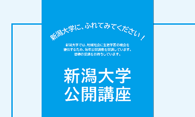 停止 開始 新型コロナウイルス感染症関連のお知らせ 新型コロナウイルス感染症に関する対応(2021年12月23日更新) 学生向け重要なお知らせ(2021年12月24日更新) 【学生・教職員の皆さんへ】学長メッセージ-コロナ後を見据えた新しい日常に向けて-(2021年11月29日掲載) 【学生の皆さんへ】新型コロナウイルス感染症の影響により家計が急変した学生に対する経済的支援について(2021年10月8日更新) 【学生の皆さんへ】令和3年度第2学期の授業実施について(2021年8月10日掲載) 入試情報ピックアップ 令和4年度私費外国人留学生特別選抜学生募集要項を公開しました 令和4年度一般選抜学生募集要項を公開しました 令和4年度帰国生徒特別選抜学生募集要項を公開しました 【受験生の皆さんへ】新型コロナウイルス感染症拡大に伴う本学の入学試験における対応について Features 学長メッセージ ドナルド・マクドナルド・ハウス にいがた(小児医療宿泊施設)の募金 新大生の活躍 Activity Report 受験生特設サイト 数字で見る新潟大学 動画で見る新潟大学 広報誌・刊行物 News すべて トピックス 入試情報 研究成果 お知らせ トピックス2021年12月28日 令和3年度白衣式を開催しました 入試情報2021年12月28日 令和5年度農学部学校推薦型選抜配点の公表について トピックス2021年12月27日 第13回U-goサロン「知のポットラックスペシャル2021」を開催しました トピックス2021年12月27日 本学教員がダイバーシティに関するグッドプラクティスとして事例発表しました お知らせ2021年12月24日 【学生の皆さんへ】『学生等の学びを継続するための緊急給付金』の申請について掲... トピックス2021年12月24日 農学部国際シンポジウム(ISFAE 2021 NIIGATA)を開催しました ニュース一覧を見る Events 2022.1.6 講演会等 2022 1/6 木 第45回災害環境科学セミナー「沿岸の地形・地質・生物の痕跡から探る過去の地震」 2022.1.8 講演会等 2022 1/8 土 国際シンポジウム「住民参加のあり方をめぐる国際的対話―政策過程とローカル・ガバナンス」 2022.1.8 展示 2022 1/8 土- 2/12 土 旭町学術資料展示館企画展「中村恭子日本画作品展「書割少女」」 イベント一覧を見るカレンダーを見る Quick Links 附属図書館 医歯学総合病院 脳研究所 災害・復興科学研究所 環東アジア研究センター 佐渡自然共生科学センター 日本酒学センター 駅南キャンパスときめいと 新大と繋がる・支える 新潟大学生活協同組合 Databases シラバス検索 新潟大学学術リポジトリ 研究者総覧 Instagram 新潟大学 公式SNS