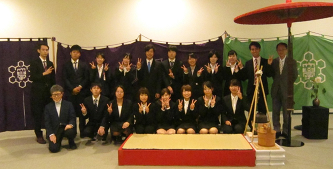 第69回新潟市民茶会は、10月6日(日)、市内8会場に13席が設けられました。新潟大学茶道部は白山公園桜の丘で野点をする予定でしたが、あいにくの天候のため市民芸術文化会館4階ギャラリーに席を設置しました。