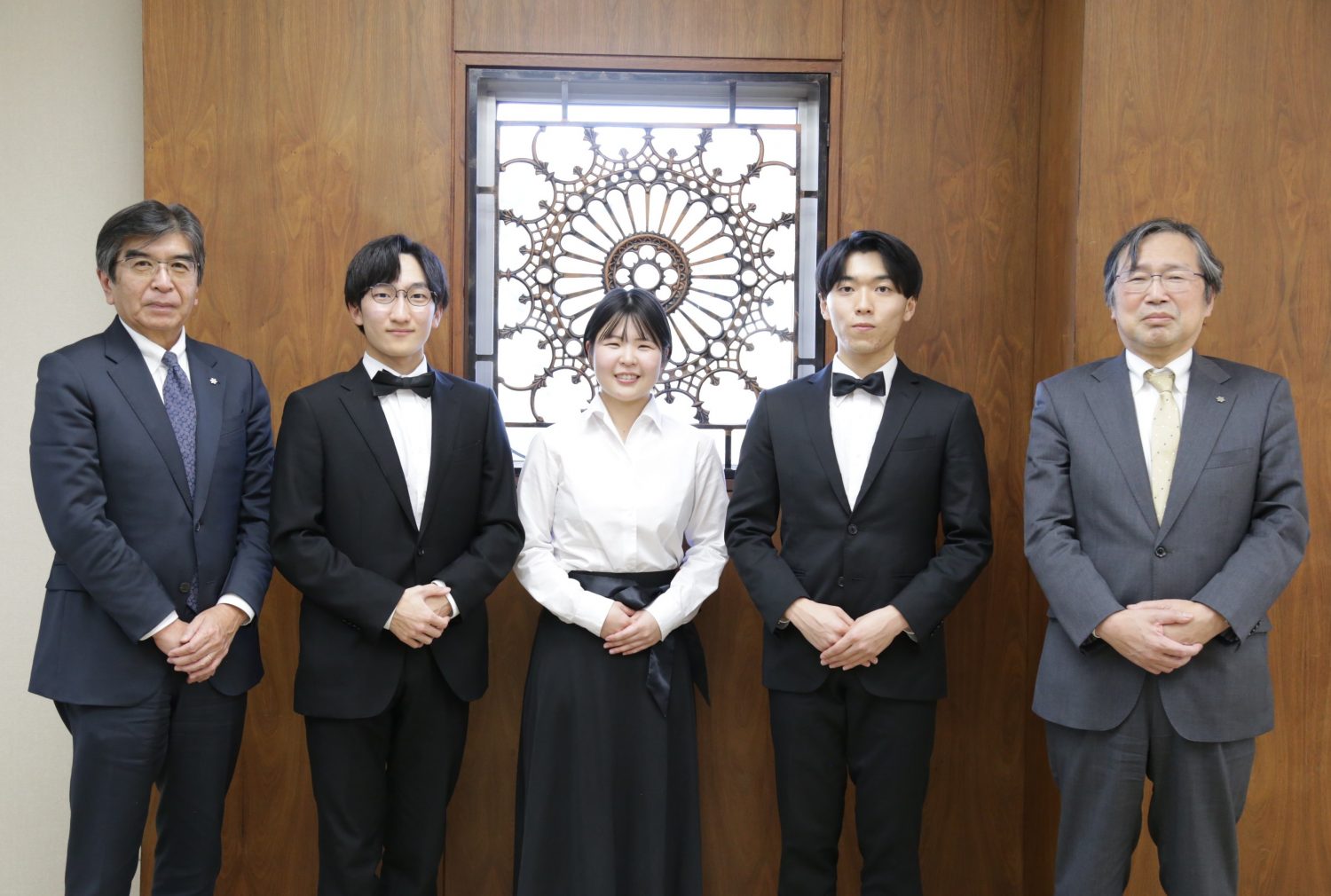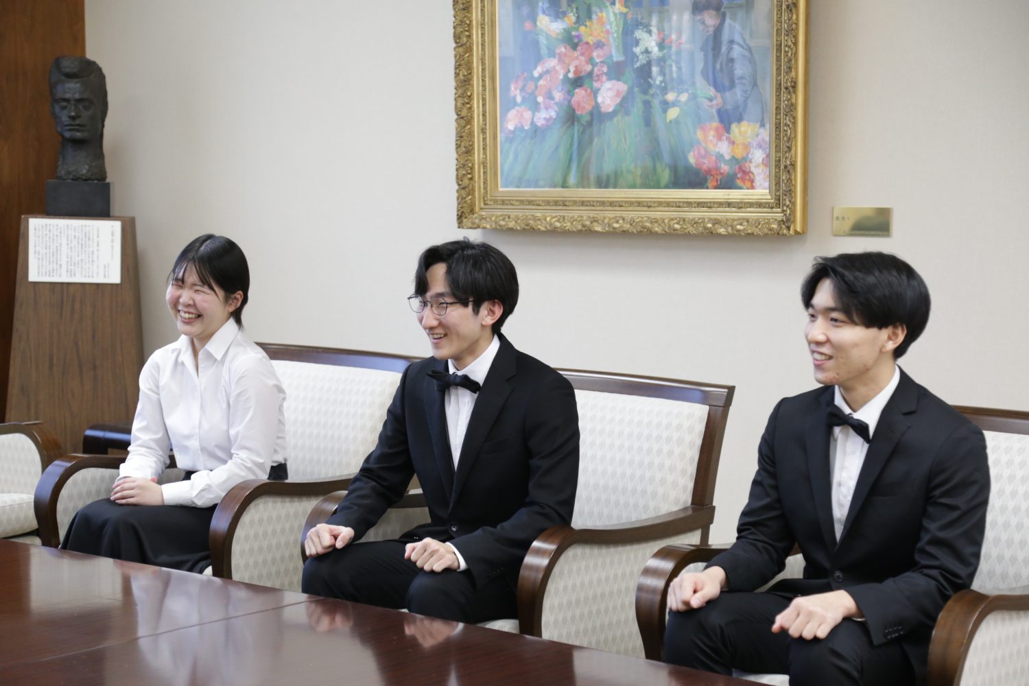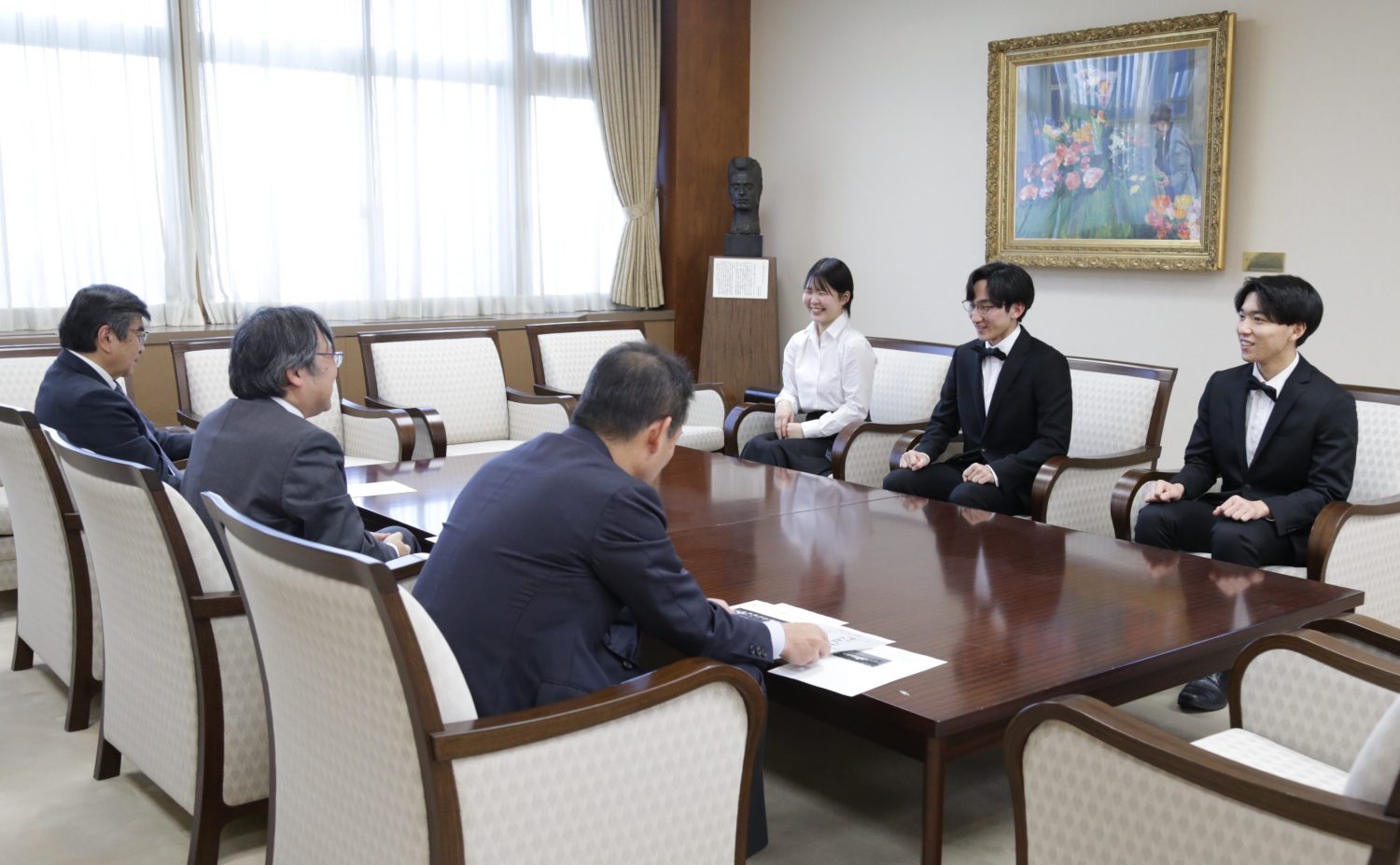 学生指揮者の佐藤凪彩さんから、14団体が出場した大学ユースの部において、銀賞を受賞したことの報告があった後、牛木学長、坂本理事、𠮷井学務部長との懇談を行いました。