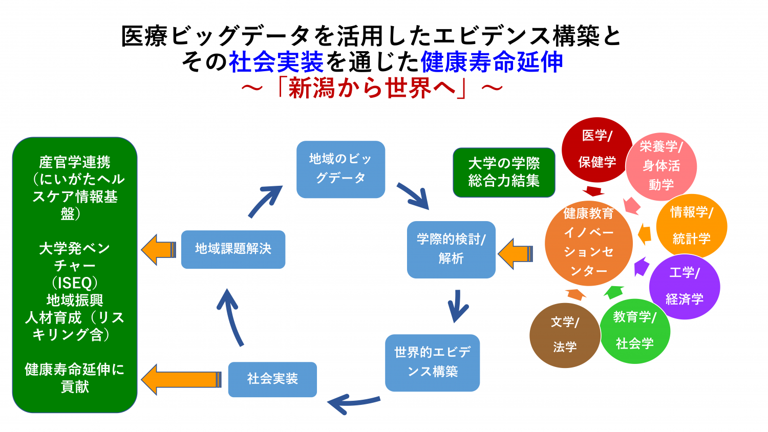 新潟大学全学および学外からの多分野研究者を学際的に結集し、社会に眠る多くのビッグデータから健康増進に役立つ科学的エビデンスを確立すると共に、それを先端的な健康教育手法を駆使し社会実装することにより、人々の寿命・健康寿命延伸、疾患(重症化)予防、生活の質(QOL)向上を実現するための研究開発および教育を行っています。 |