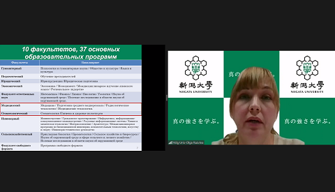 Презентация российского студента, прошедшего обучение за счет собственных средствВторой день онлайн-ярмарки 10 декабря (пт) - «Niigata Day», был посвящен Ниигате и ориентирован в основном на Дальневосточный регион России, который географически близко расположен к префектуре Ниигата. Во время мероприятия была предоставлена различная информация об образовательных институтах, промышленности, туризме, трудоустройстве и т.д в префектуре. 8 образовательных институтов префектуры, включая вузы, колледжи и техникумы, местная администрация в лице префектуры и муниципалитета, Институт экономических исследований Северо-Восточной Азии «ERINA» (далее, «ERINA»), а также ведущая бизнес с Россией «Корпорация Атаго», приняли участие во второй программный день.