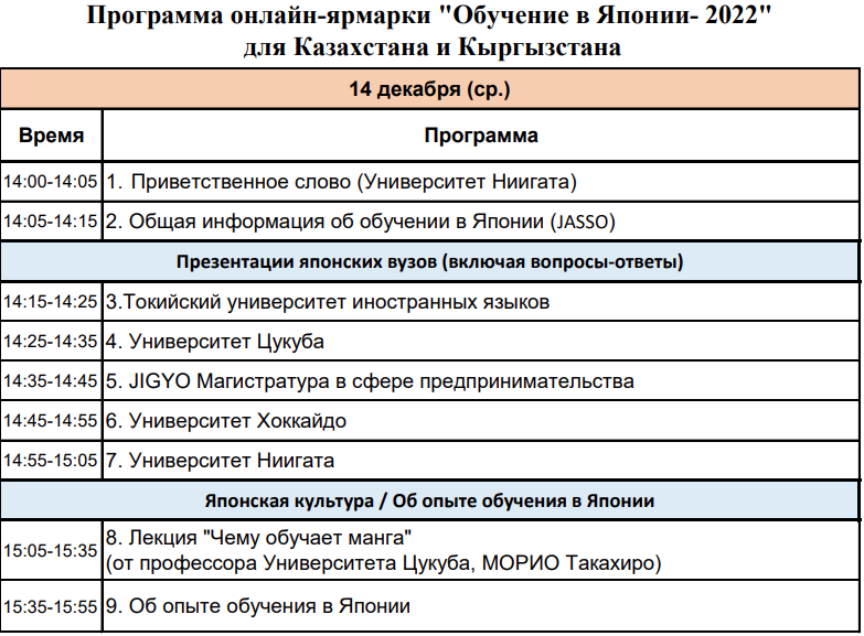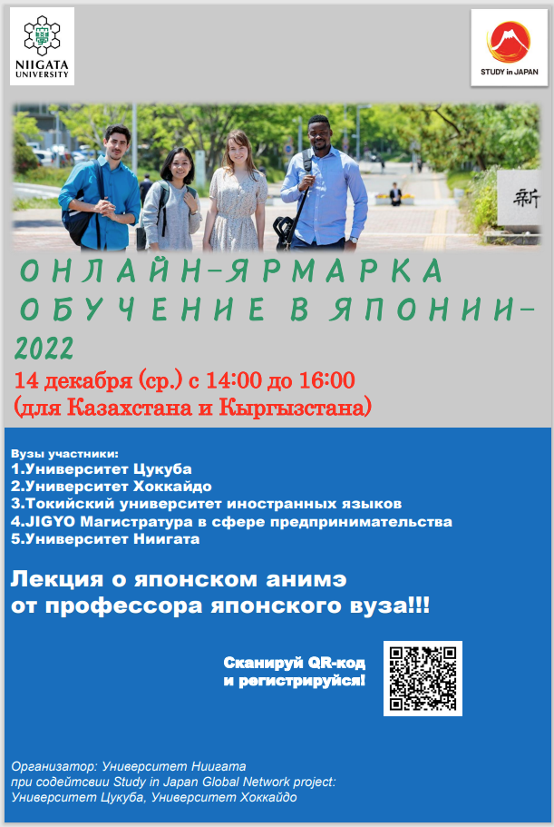 14 декабря 2022 г. (ср) Университет Ниигата организует онлайн-ярмарку "Образование в Японии - 2022" для Казахстана и Кыргызстана. В ярмарке смогут принять участие студенты, изучающие японский язык, планирующие обучение в магистратуре в Японии, учащиеся старших классов, а также представители образовательных институтов.