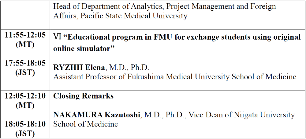 6. RYZHII Elena, M.D., Ph.D., Assistant Professor of Fukushima Medical University School of Medicine, "Educational program in FMU for exchange students using original online simulator"
