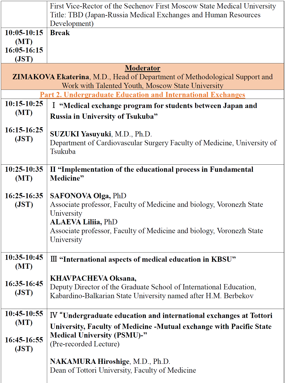 1. SUZUKI Yasuyuki, M.D., Ph.D., Department of Cardiovascular Surgery Faculty of Medicine, University of Tsukuba, "Medical exchange program for students between Japan and Russia in University of Tsukuba"