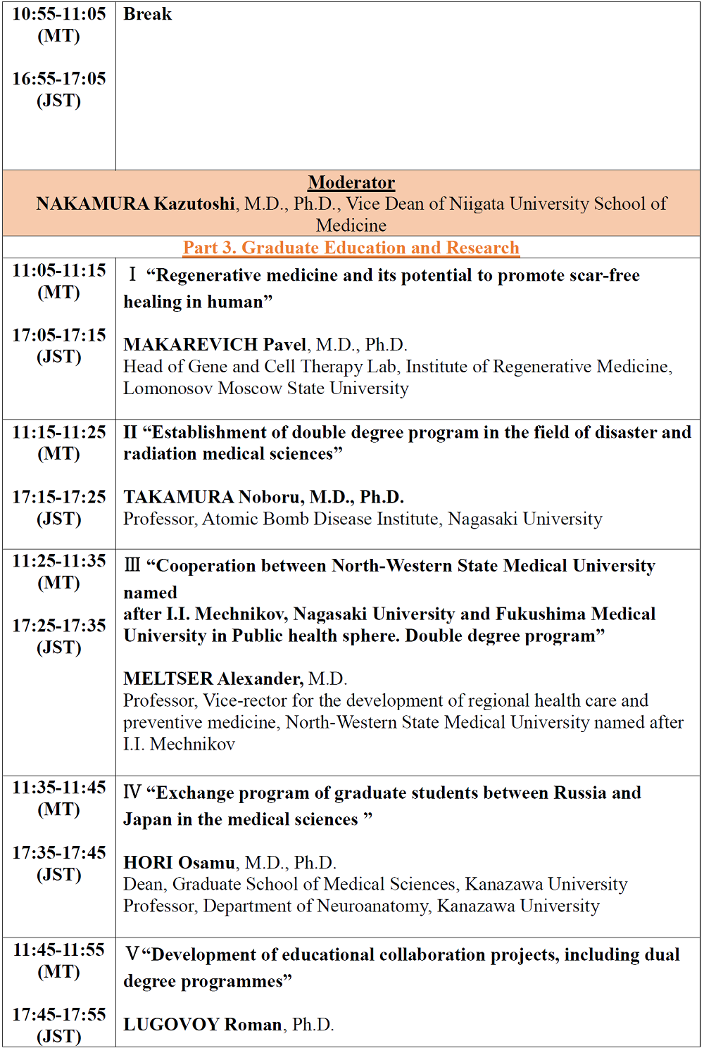 3. MELTSER Alexander, M.D., Professor, Vice-rector for the development of regional health care and preventive medicine, "Cooperation between North-Western State Medical University named after I.I. Mechnikov, Nagasaki University and Fukushima Medical University in Public health sphere. Double degree program"