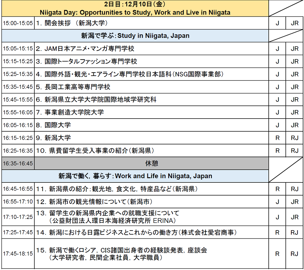 2日目となる12月10日(金)は、新潟大学が拠点を置く新潟県に焦点を当てた「日本留学フェア・新潟デー」を実施します。新潟県内の大学や専門学校が各校の紹介を行うほか、ロシア人や外国人を雇用している県内の企業やシンクタンク、行政も参加します。新潟県の産業や観光のほか、留学生の就職機会についても、各参加機関から貴重なお話を聞くことができます。新潟県内で学び、働き、暮らすためのヒントが、1日で手に入る充実した内容です。新潟県で学ぶ、働くことに興味がある人も、新潟についてあまり知識がない人も、ぜひ、この機会を利用し、新潟の特徴や魅力に触れてみてください!