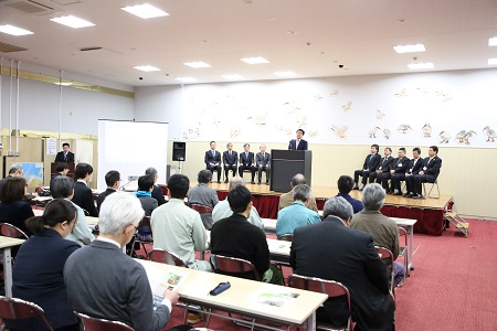 Niigata University integrated three facilities, the Marine Biological Station (Faculty of Science), the Field Center for Sustainable Agriculture and Forestry Division of Sustainable Forestry (Faculty of Agriculture) and the Center for Toki and Ecological Restoration (Institute for Research Promotion), which had been set on Sado Island, and newly established the Sado Island Center for Ecological Sustainability on April 1. Its opening ceremony was held at Sado Toki Fanclub Hall on April 5.