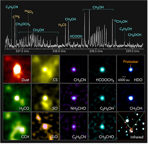 Fig.2 Top: Radio spectrum of a protostar in the extreme outer Galaxy discovered with ALMA. Bottom: Distributions of radio emissions from the protostar. Emissions from dust, formaldehyde (H2CO), ethynylradical (CCH), carbon monosulfide (CS), sulfur monoxide (SO), silicon monoxide (SiO), acetonitrile (CH3CN), formamide (NH2CHO), propanenitrile (C2H5CN), methyl formate (HCOOCH3), ethanol (C2H5OH), acetaldehyde (CH3CHO), deuterated water (HDO), and methanol (CH3OH) are shown as examples. In the bottom right panel, an infrared 2-color composite image of the surrounding region is shown (red: 2.16 μm and blue: 1.25 μm, based on 2MASS data).