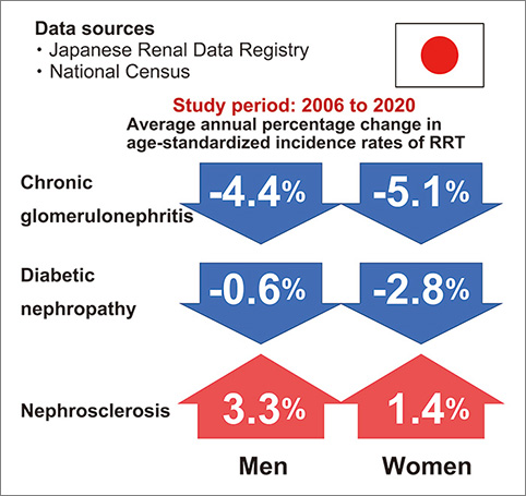 A new Japanese study reveals that the age-standardized incidence rates of end-stage kidney disease (ESKD) requiring renal replacement therapy (RRT) due to chronic glomerulonephritis and diabetic nephropathy has decreased, while rates due to nephrosclerosis have increased considerably between 2006 and 2020. Age-specific incidence rates of RRT attributed to nephrosclerosis also increased in many age groups, suggesting that the increased number of patients with nephrosclerosis as a primary kidney disease is not only due to the increasing number of older people, but also due to increasing age-specific incidence rates.