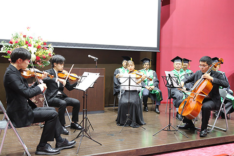 At the ceremony, President USHIKI awarded degrees to the representatives of graduating students receiving bachelor's degrees and graduate degrees. Next followed President USHIKI's graduation address, stating, "Niigata University is your alma mater and your home. Stride ahead with the pride that you have studied at this university. Niigata University will continue to watch over you, wishing your success in your future career. Please always remember the philosophy of Niigata University. Let me close this message by reiterating my hope that you will cherish your bond with the university wherever you are as you play an active role as front-runner of future life innovation. To this aim, please maintain your intellectual curiosity even after your graduation and never forget to keep on learning. I wish you a lot of happiness ahead." The graduates attended the ceremony with a sobering look on their faces in the presence of family members, faculty and staff.