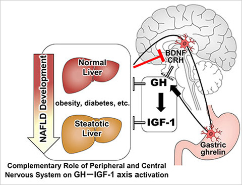 - We have discovered that Ghrelin3 secreted from the stomach activates the growth hormone (GH) release from the pituitary gland through neural signal transduction, and growth hormone in the bloodstream induces insulin-like growth factor 1 (IGF-1) secretion from the hepatocytes, which suppresses the MASLD progression.