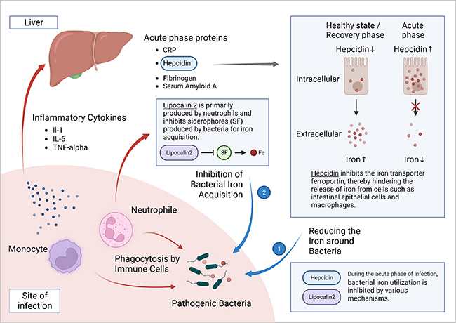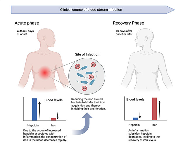 A research group consisting of associate professor MORO Hiroshi of the Division of Infection Control and Prevention and full-time assistant professor BAMBA Yuuki of the Division of Respiratory and Infectious Diseases, Niigata University Medical and Dental Hospital, and Professor KIKUCHI Toshiaki of the Division of Respiratory and Infectious Diseases, Graduate School of Medical and Dental Sciences revealed the iron metabolism dynamics in severe infections. In this study, iron concentration over time in patients with bloodstream infections1 indicated a rapid fluctuation pattern of decreasing during the acute phase and recovering as the patient improved. Furthermore, this behavior of the iron blood concentration was caused by hepcidin2, an iron regulator associated with inflammation (Fig. 1). These iron metabolism dynamics are part of the immune response by the host, as they prevent bacteria from acquiring iron, an essential nutrient, and suppress their proliferation (Fig. 2). This research demonstrates the close relationship between iron metabolism and infectious diseases in clinical practice, and will bring new perspectives to the diagnosis and treatment of infectious diseases.