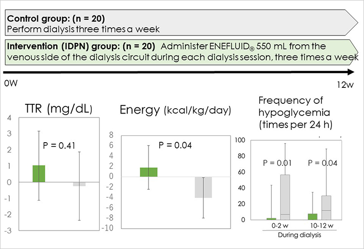 To investigate this, a research group from Tokyo Medical University, Niigata University, and Otsuka Pharmaceutical Factory conducted a 12-week randomized controlled trial to evaluate the effects of IDPN using ENEFLUID® (310 kcal, 550 mL) in malnourished hemodialysis patients.