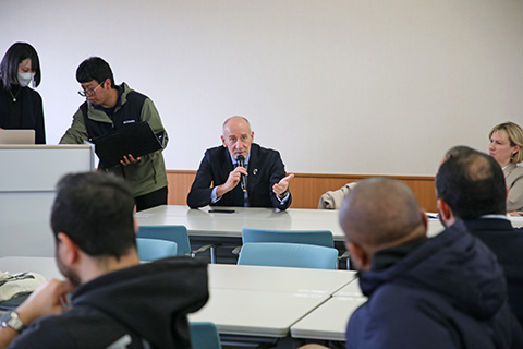 In the lecture, Ambassador PAQUET explained the relationship between the EU and Japan to an audience of approximately 170 students, stressing the importance of studying agricultural science as a way to help solve major global problems such as climate change and current social challenges. At the end of the lecture, a first-year student from the Faculty posed a question in English about the role of agricultural science in conflict resolution, reflecting the students' deepening interest in how their field of study can contribute to society. Following the lecture, the Ambassador engaged in a discussion with international students majoring in agricultural science and actively exchanged views with them.