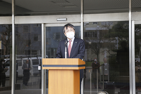 At the ceremony, the plaque was unveiled as the start of the new Faculty following the address from the President, Prof. USHIKI Tatsuo and the Dean, Prof. YAMAZAKI Takeshi.