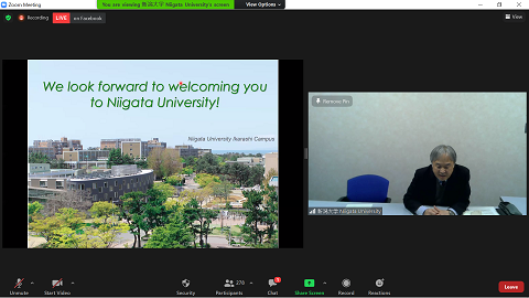 As a representative of our university, Prof. Nozomu TSUBOI, the Vice President for Global Engagement gave a presentation on introductions to Niigata city, and Niigata University as well as a guide to studying at Niigata University. The following message from Mr. Reza Kurniawan Arta, an Indonesian PhD student of Graduate School of Medical and Dental Sciences, Niigata University was conveyed in the end of the presentation, and the participants eagerly listened.