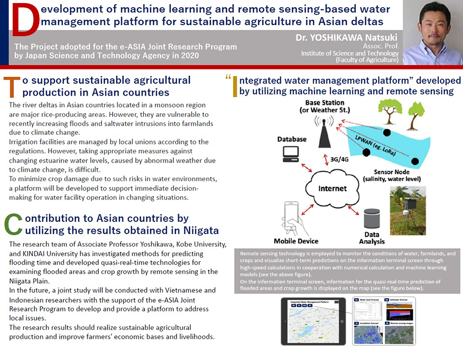 The adopted project aims to develop an integrated water management platform to monitor and predict the conditions of water, farmlands, and crops for supporting sustainable agriculture through collaboration between Japanese institutes (Niigata University, Kobe University, and KINDAI University) and the Institute of Water Resources Planning in Vietnam and the Bogor Agricultural University in Indonesia, where deltas are formed. The platform utilizes machine learning and remote sensing for proper water management to reduce agricultural damage, such as floods and saltwater intrusions, commonly observed in deltas, based on objective and immediate information.