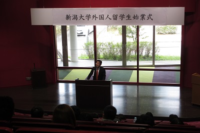 After the opening remark by Prof. Yasuhiko Yukawa, the director of Global Education Center, President Sugata Takahashi gave his welcome address encouraging the new students. "In addition to what you learn from class, please also learn a lot about Japanese culture and history and enjoy rich nature and food in Niigata in your daily lives. I hope that all of you students will develop your potential and possibilities in this ideal environment." He also urged the students to make many friends. "The friendship you form during your student years will become your lifetime assets and will further enrich your life", he said.