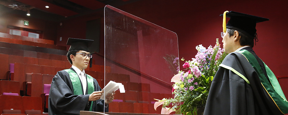 With a view to preventing the spread of the novel coronavirus infectious disease (COVID-19), separate ceremonies took place at several places, such as lecture rooms of each faculty and graduate school.