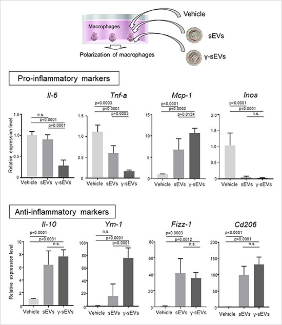 The AD-MSC-γ-sEVs effectively downregulate pro-inflammatory (IL-6, Tnf-a, Mcp-1, and Inos) and induce anti-inflammatory (iL-10, Ym-1, Fizz-1, Cd206) macrophage responses and in vitro.
