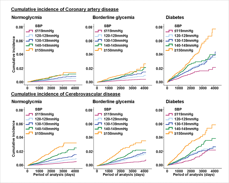 In the Diabetes Care paper, the authors addressed these research questions using a nationwide claims-based database that included information on 805,992 people enrolled with a health insurance provider for company employees and their dependents in Japan. In one arm of the study, they compared the cumulative incidence of coronary artery disease according to their SBP in individuals with normal, borderline and elevated blood glucose, separately (Figure). The authors reported that, "a linear relationship was observed between cumulative incidence rates of coronary artery disease and SBP categories across all glucose tolerance status designations using SBP below 119 mmHg as the reference". In another arm of the study, the investigators compared the cumulative incidence of cerebrovascular disease according to their SBP in individuals with normal, borderline and elevated blood glucose, separately (Figure). Similarly, the authors observed a linear dose-response relationship between cumulative incidence rates of cerebrovascular disease and SBP categories across all glucose tolerance status. Furthermore, the investigators repeated similar analyses using the DBP and reported that "Similar to the relationship between SBP and coronary artery disease and cerebrovascular disease; the coronary artery disease and cerebrovascular disease risk concurrently increased with higher DBP categories".