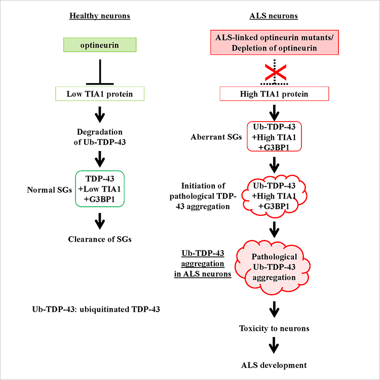 Figure 1. Development of ALS. ALS-linked mutations of optineurin (OPTN) and depletion of OPTN delay clearance of SGs and increases ubiquitinated TDP-43 levels by increasing TIA1.