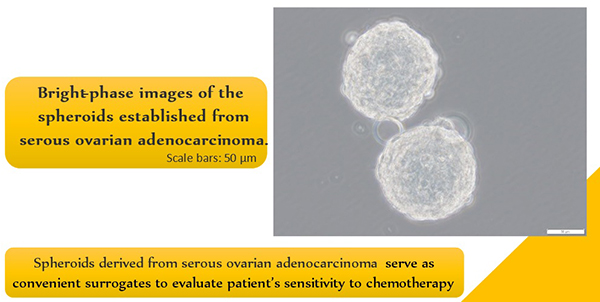 Spheroids derived from serous ovarian adenocarcinoma serve as convenient surrogates to evaluate patient’s sensitivity to chemotherapy. (Scale: 50µm)