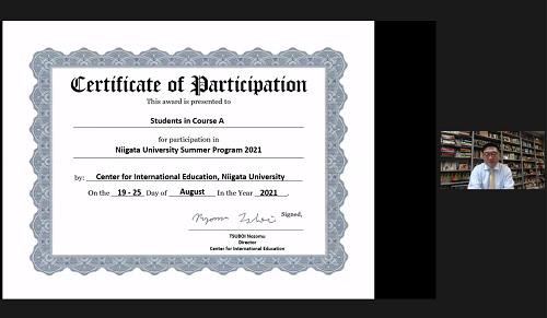 The program ended with the closing remarks from Prof. TSUBOI, the Vice President for Global Engagement: "Our society seeks global leaders who are capable of solving global problems. In addition to expertise, communication skills based on the understanding of different culture are vital. I would like you to try not only online study abroad programs but also actual study abroad programs after the covid-19 pandemic settles. We all look forward to seeing you at Niigata University."