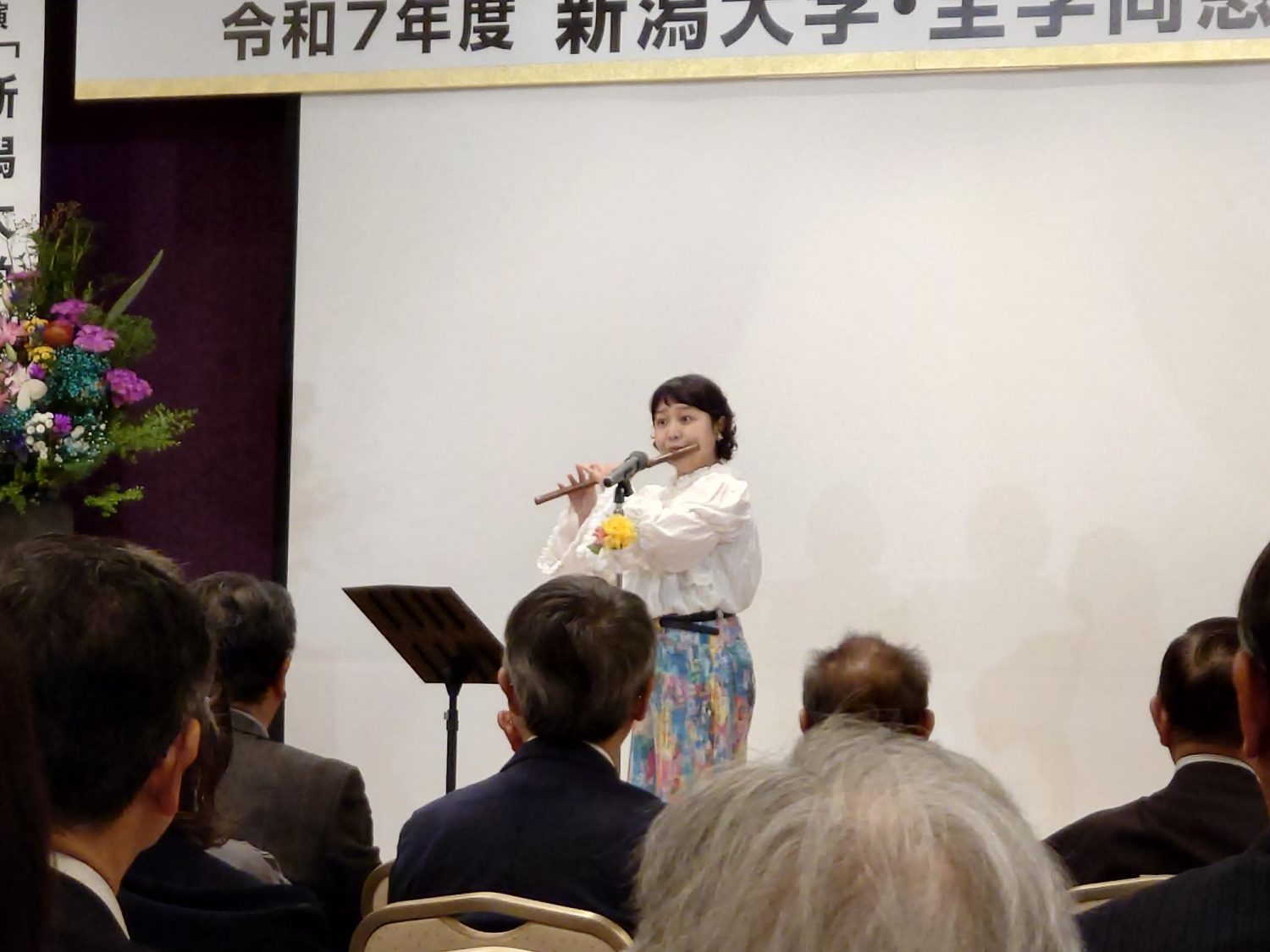 当日は、卒業生や関係者など多くの方々が参加し、司会を務めた新潟大学全学同窓会運営委員・教育学部同窓会の松井裕美の進行のもと、篠笛奏者・渡辺百枝氏による演奏で幕を開けました。渡辺氏は新潟市出身で、国内外で活躍されており、「アメージンググレース」と「新潟大学学生歌」の2曲を披露し、会場を美しい音色で包みました。