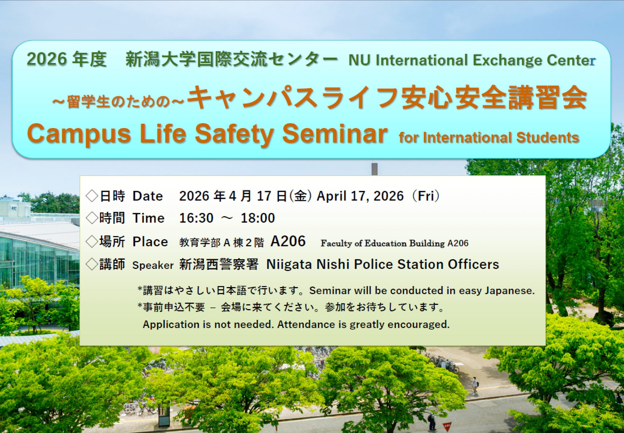 新潟大学の留学生の安全を守るために、警察による「キャンパスライフ安心安全講習会」が開催されます。