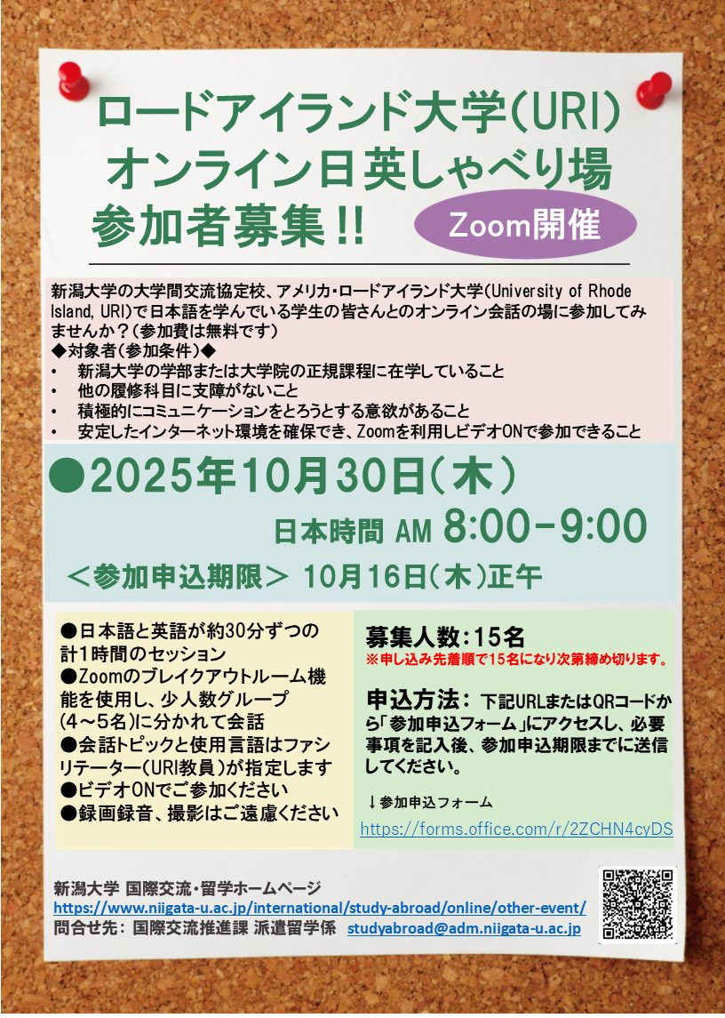 新潟大学の大学間交流協定校であるアメリカ・ロードアイランド大学(University of Rhode Island, URI)で日本語を学んでいる学生の皆さんとのオンライン会話の場、「オンライン日英しゃべり場」を10月に開催します。毎回参加者に大好評のイベントです。奮ってご参加ください!