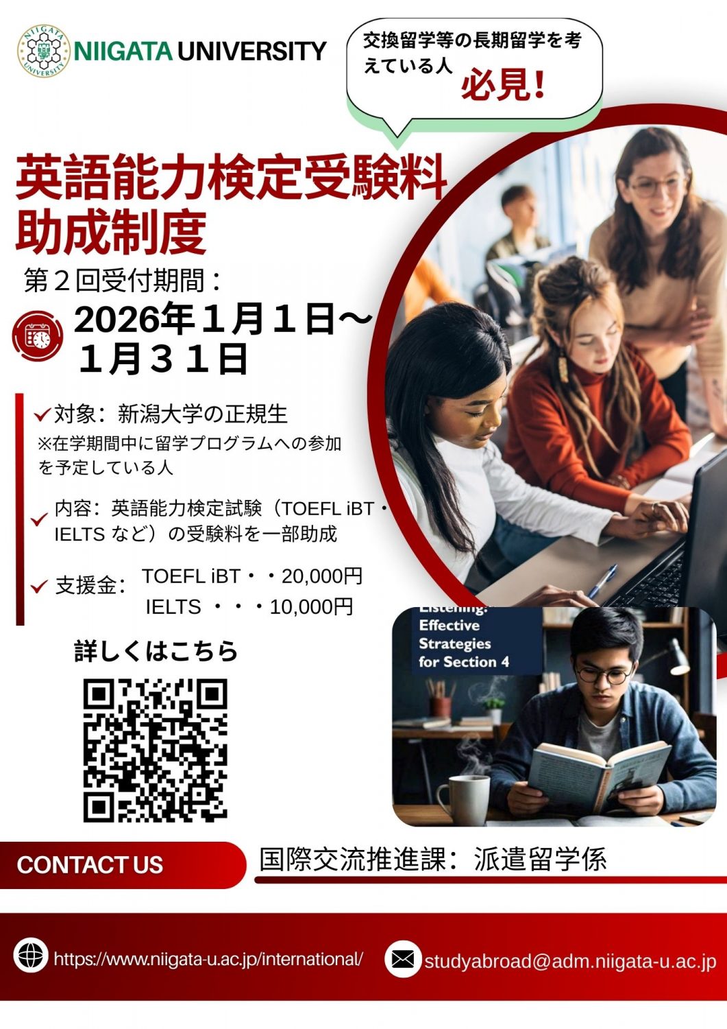 新潟大学では交換留学等長期留学促進のための海外留学支援の一環として,派遣先大学の語学要件である英語能力検定試験のうち,本学が指定する下記検定試験を受験した者に対し,受験料の一部を補助します。