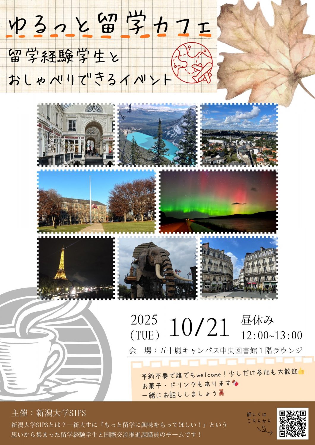 新潟大学SIPSの初めての活動として、留学促進イベント「ゆるっと留学カフェ」を開催します。