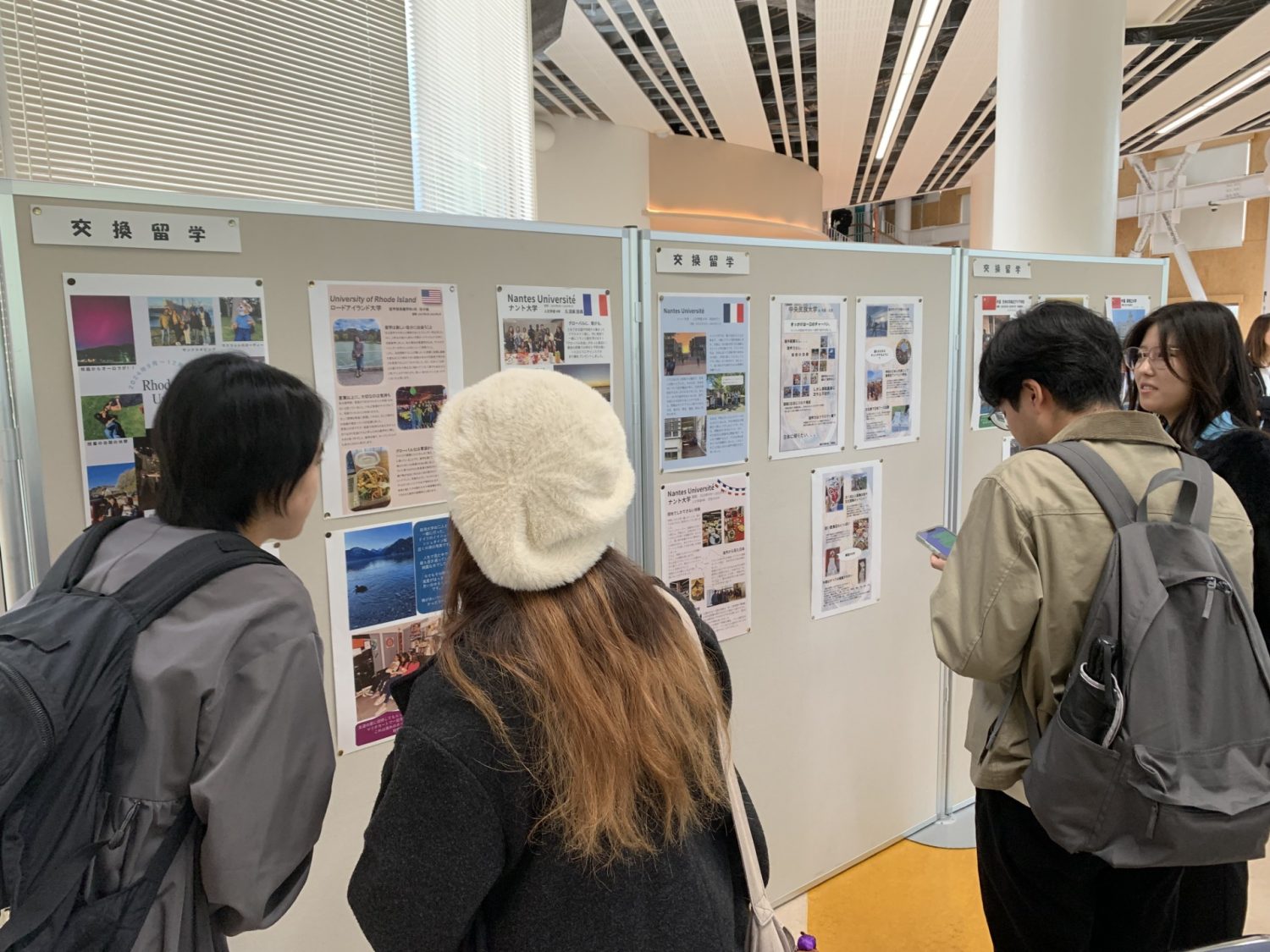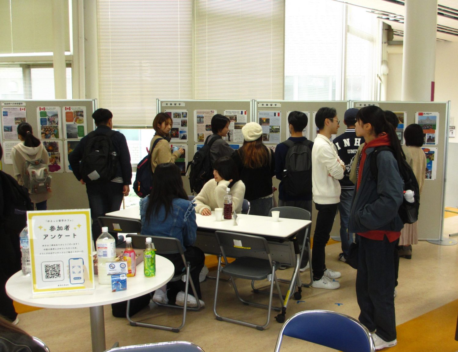 会場には、これまでに短期・長期の留学を経験した学生たちから多くのポスターが集まり、当日も総勢20名ほどの留学経験学生たちが駆けつけてくれました。参加者はそれぞれ、お菓子とドリンクを片手に、個性あふれるポスターや写真の展示を楽しんだり、留学経験学生とのおしゃべりに花を咲かせたりしていました。
