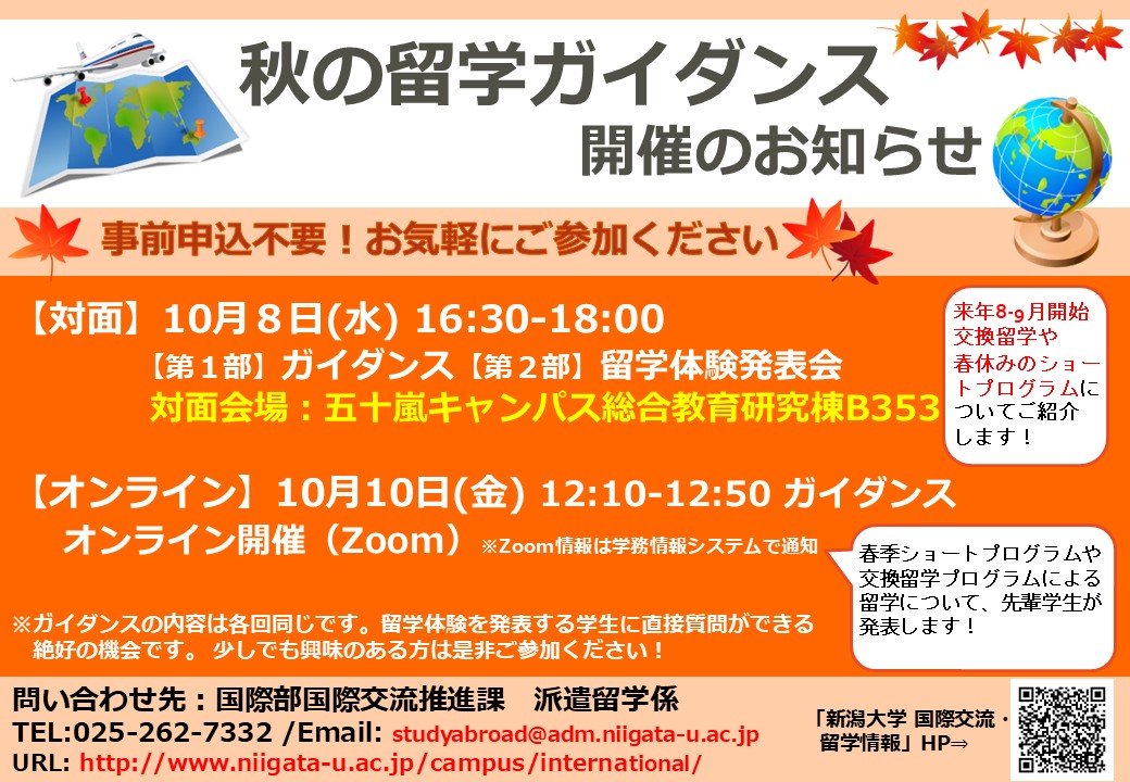 国際交流推進課では,毎年春と秋に全学を対象とした「留学ガイダンス」を開催しています。事前予約は不要ですので,留学に興味のある方は,