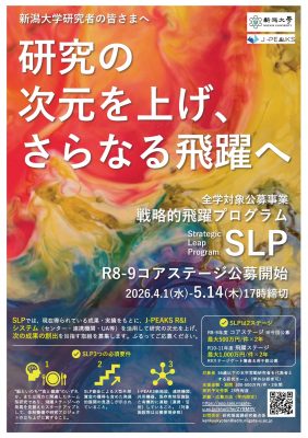 地域中核・特色ある研究大学強化促進事業(J-PEAKS)の一環として、本学の研究力およびイノベーション創出力の飛躍的向上を目的に、「戦略的飛躍プログラム(Strategic Leap Program:SLP)」の公募を開始します。
