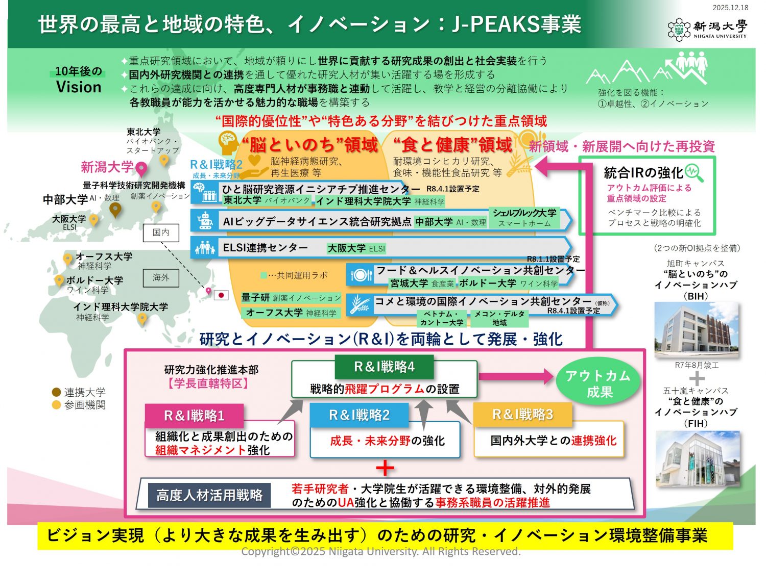 新潟大学は、国際的優位性や特色ある分野を結びつけた、“脳といのち”と“食と健康”という2つの重点領域を柱に、文部科学省の令和6年度「地域中核・特色ある研究大学強化促進事業(J-PEAKS)」に採択されました。研究とイノベーションを両輪に、研究者・高度専門人材・事務系職員等の活躍を推進力として、地域と世界に貢献する未来社会のイノベーションの創出を目指します。