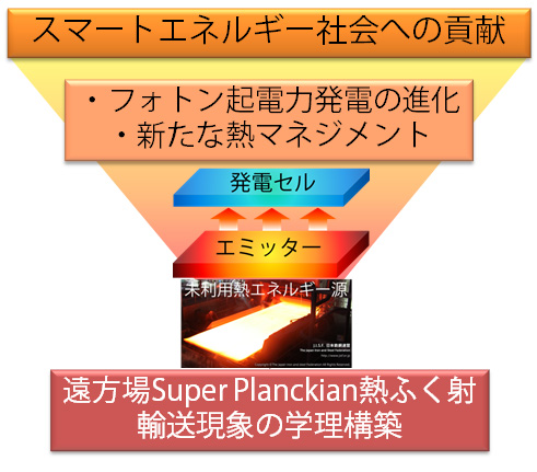ドイツの物理学者,マックス・プランク(1858-1947)は,「量子論の父」とも呼ばれ,1918年にノーベル物理学賞を受賞しています。本研究は,伝熱学の教科書にある黒体放射法則(※)の一部を書き換えるための基礎研究となる可能性があります。本研究で櫻井篤准教授は,メタマテリアルによる遠方場コヒーレント熱ふく射輸送に着目し,このフォトン輸送機構の解明に取り組みます。これが成功すれば,黒体放射限界を遥かに超える遠方場Super Planckian熱ふく射輸送が実現でき,その放射機構を自由自在に制御することが可能となります。さらに,この原理原則に基づいたフォトン起電力発電の高度化を目指し,未来のスマートエネルギー社会の構築に貢献します。