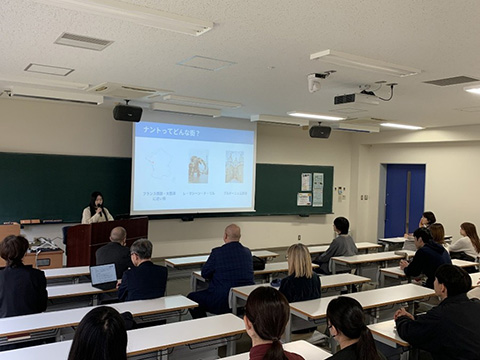 続いて本学学生から、交流協定校であるナント大学へ留学した際に体験した現地での学びや多彩な生活・文化体験、さらには多種多様な背景を持つ人々との交流で得た気づきなどについて、報告が行われました。