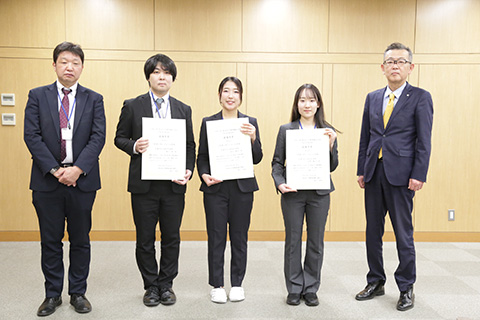 受賞した医事課職員と佐藤医歯学総合病院事務部長(写真左)、堀江理事(写真右)