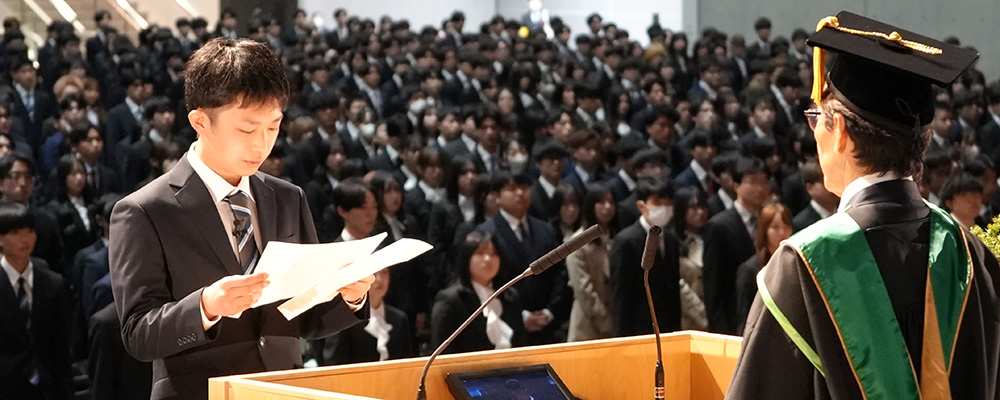 これに対し、新入生を代表して工学部の松本倫和さんから、「これまでの感謝を胸に、新潟大学の学生であるという誇りと責任を自覚し、自己の目標に向かって努力を重ねていくことをここに誓います」との宣誓が述べられました。