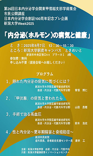 内容: | 内分泌(ホルモン)の病気と健康に関する講演ファイルを、本ページにてオンデマンド配信します。 |