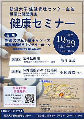 内容: | 「気分転換法」について臨床心理士からの講演と、「海外渡航者の予防接種」についてトラベルクリニックを開設されている医師からの講演会を行います。 |