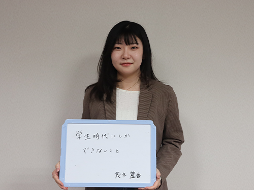 初動が大事だと思います。とりあえずやってみるということが大学に入って大切だと感じました。様々な体験を通じて学んでいくことが実社会への経験にも繋がると思います。学生にしか出来ないことが多くあるので是非チャレンジして頂ければと思います。