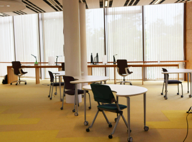 図書館です。主に自学のために利用しています。昼休みには図書館の2階でFL-SALCという英会話にも参加し、留学生とも交流しながら自分の英語力を楽しく伸ばせています。様々な学生と出会うことができ、自分の勉強にも集中できる綺麗な図書館がお気に入りです。