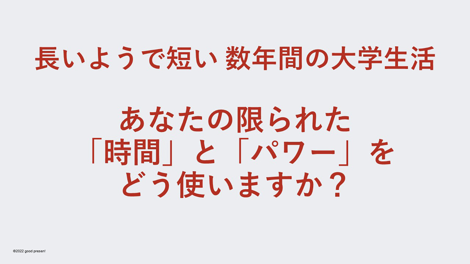 もちろん昔と同様、学んでいる内容や関心ごとは一人ひとり異なりますし、大学生活のありようも人によって様々です。一方で、昨今の時代の流れを象徴するような社会からの大学生への期待は、誰しもに等しく寄せられています。
