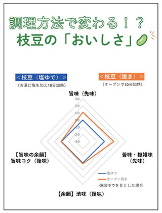 具体例として、枝豆の「塩ゆで」と「焼き」の調理方法で生じる違いを分析した結果、「焼き」の方が、旨みやコクが強いことが分かった。メニューの中にこの分析データを表示することが注文に影響を与えるのか、新潟市内の飲食店で実証実験を行った。実験の結果では、枝豆の売り上げが2倍になり、半数の人が再注文をしたいと回答したことが分かった。